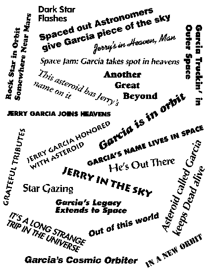 The nomenclature of celestial bodies prohibits planets, comets, moon craters and even the features of Venus from being named after dead rock stars, so "an asteroid was about the only thing left," Olszewski said. Radford and Olszewski, confirmed Deadheads who met in graduate school, found a fellow astronomer who had discovered an asteroid in 1985 and never named it. Tom Gehrels, a professor at Arizona's Kitt Peak Observatory, offered them a small asteroid in orbit between Mars and Jupiter. The asteroid, which is less than 100 miles across, can't be seen without a high-powered telescope.