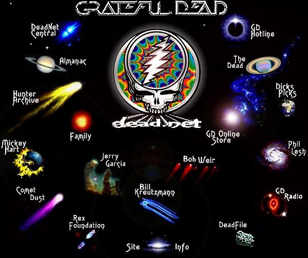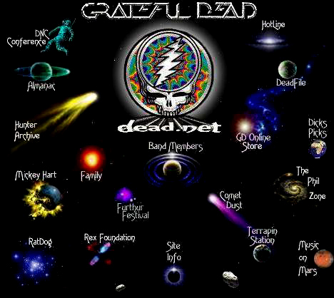 The Grateful Dead Home PageAn Internet ClassicIn 1995, Tom Paddock of SRA Networks created www.dead.net for the band and with that, a home page reflecting the "space" theme prevelant in the music of the Grateful Dead and the culture of the Deadheads. For the next 10 years this home page went through different editions as DeadNet developed and changed. In 2004 DeadNet was revamped to reflect current internet styles and that spacey homepage, beloved of deadnetters, disappeared overnigdht. It is archived here, a digital clasic, in a few versions. |